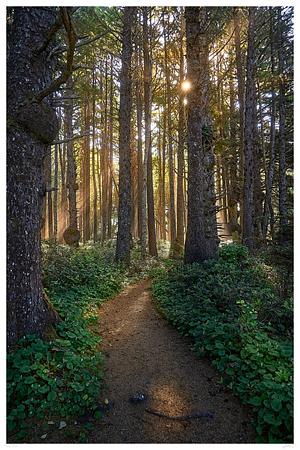 The early morning sun breaks through the salt spray forest along the trail from US 101 to Kalaloch Beach in Olympic National Park. Beams of light filter through the trees, creating a mottled glow on the lush green forest floor.