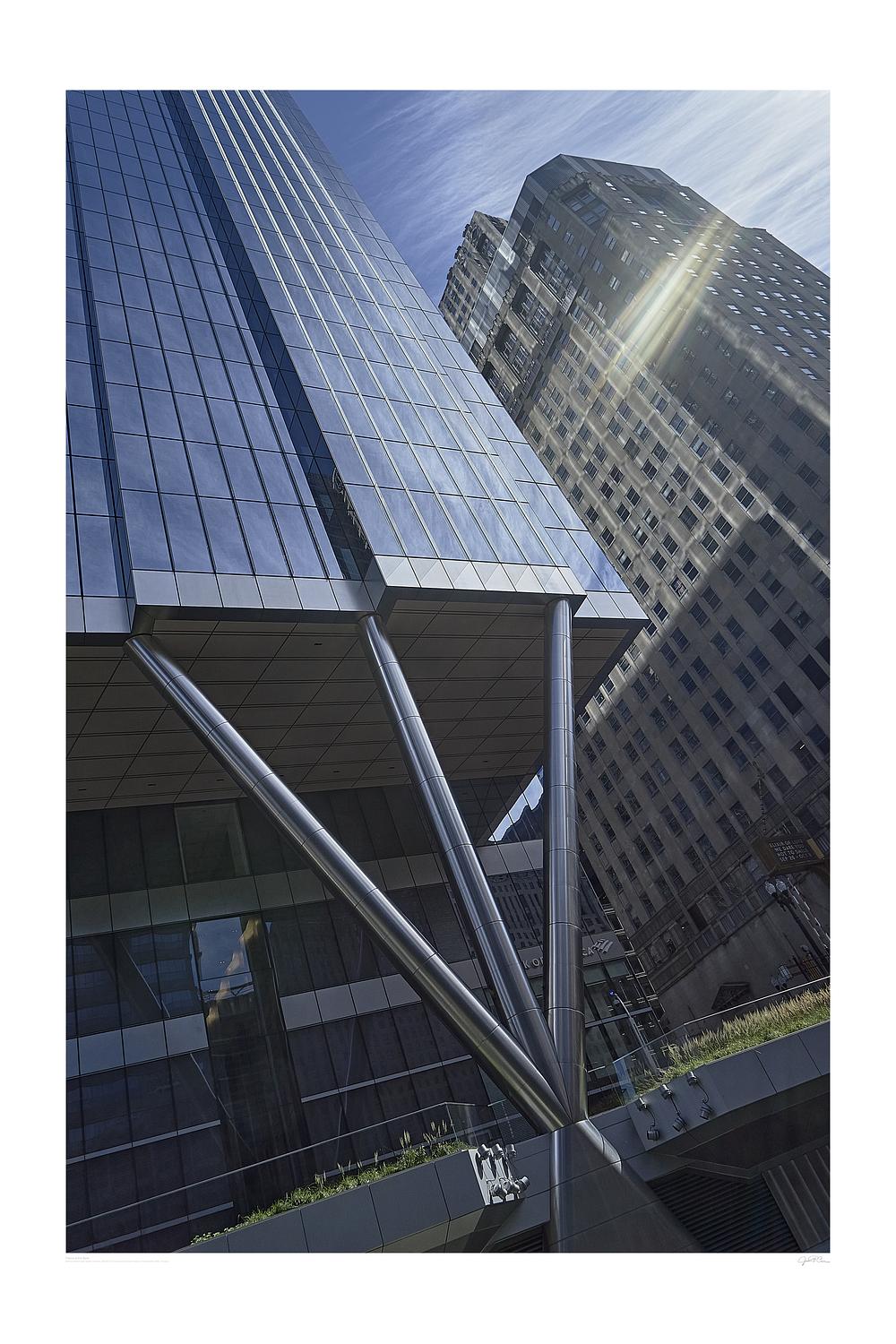Bank of America Tower looms over the Civic Opera House along the Chicago River. A fortuitous flare adds a bit of drama to the photo, which is a great contrast between two massive structures built nearly 100 years apart and of dramatically different materials.