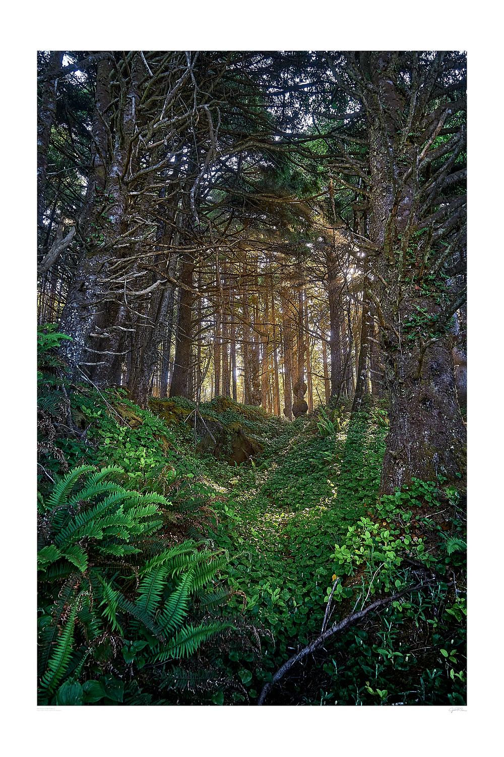 Beams of morning sunlight break through the salt spray forest along the trail from US 101 to Kalaloch Beach in Olympic National Park. The sun filters through the trees, illuminating a ravine filled with large ferns and other lush green flora.