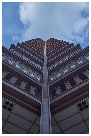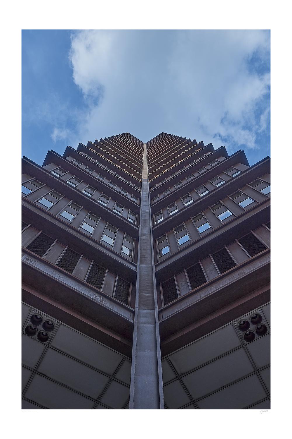 U.S. Steel Tower, the tallest building in the Pittsburgh skyline, towers ominously over its neighbors. Appearing black from a distance, up close you can see the oxidized red appearance of the Cor-ten steel used to create the massive structure.