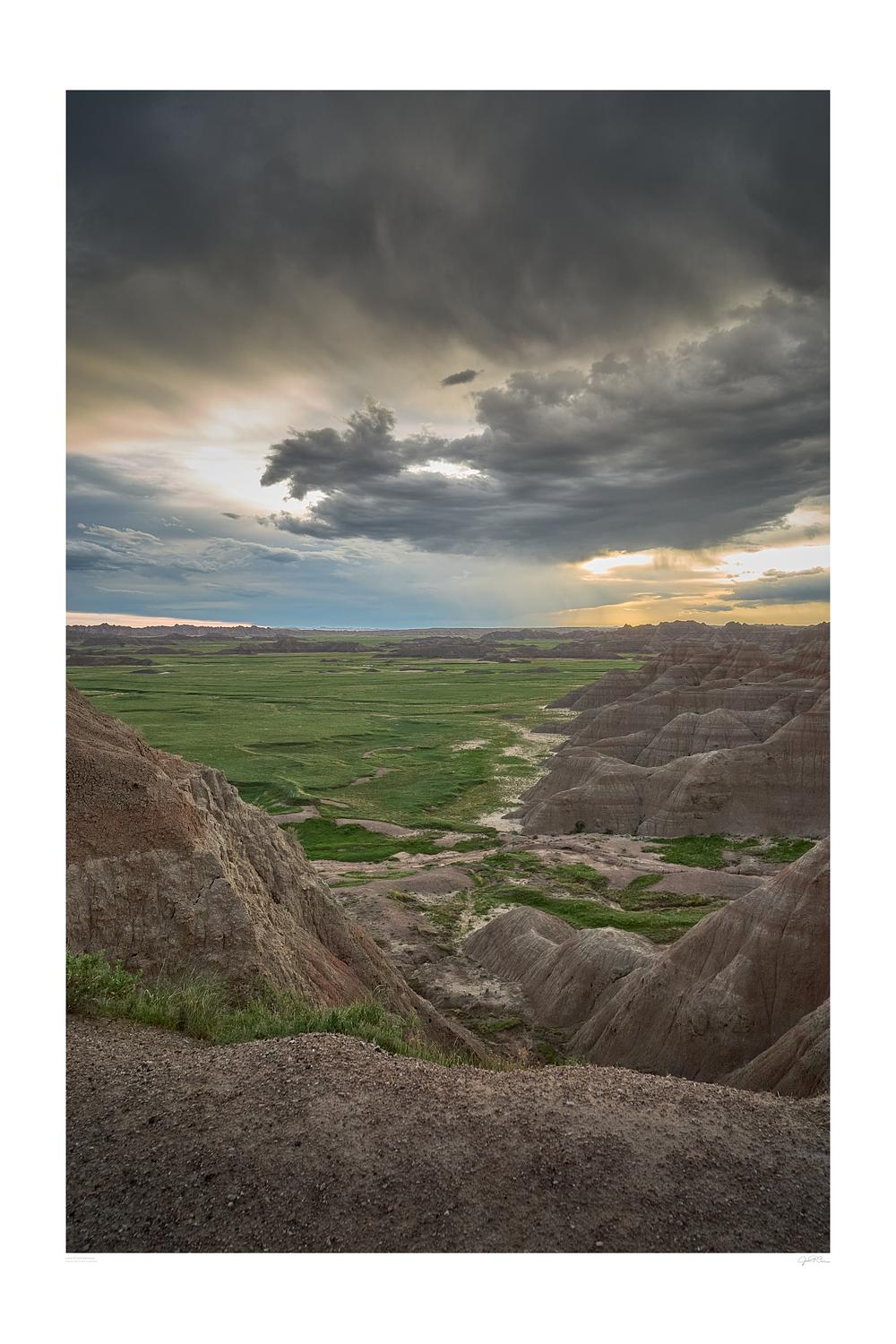 Contradictions abound in Badlands National Park, where green grasslands meet eroded, barren pinnacles, creating the starkest of contrasts. On this visit, the contradictions were further heightened by the battle between bright, late-day sunshine and dark, ominous storm clouds.