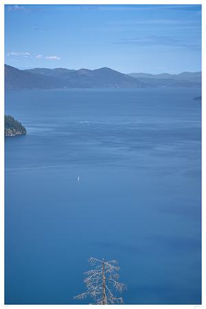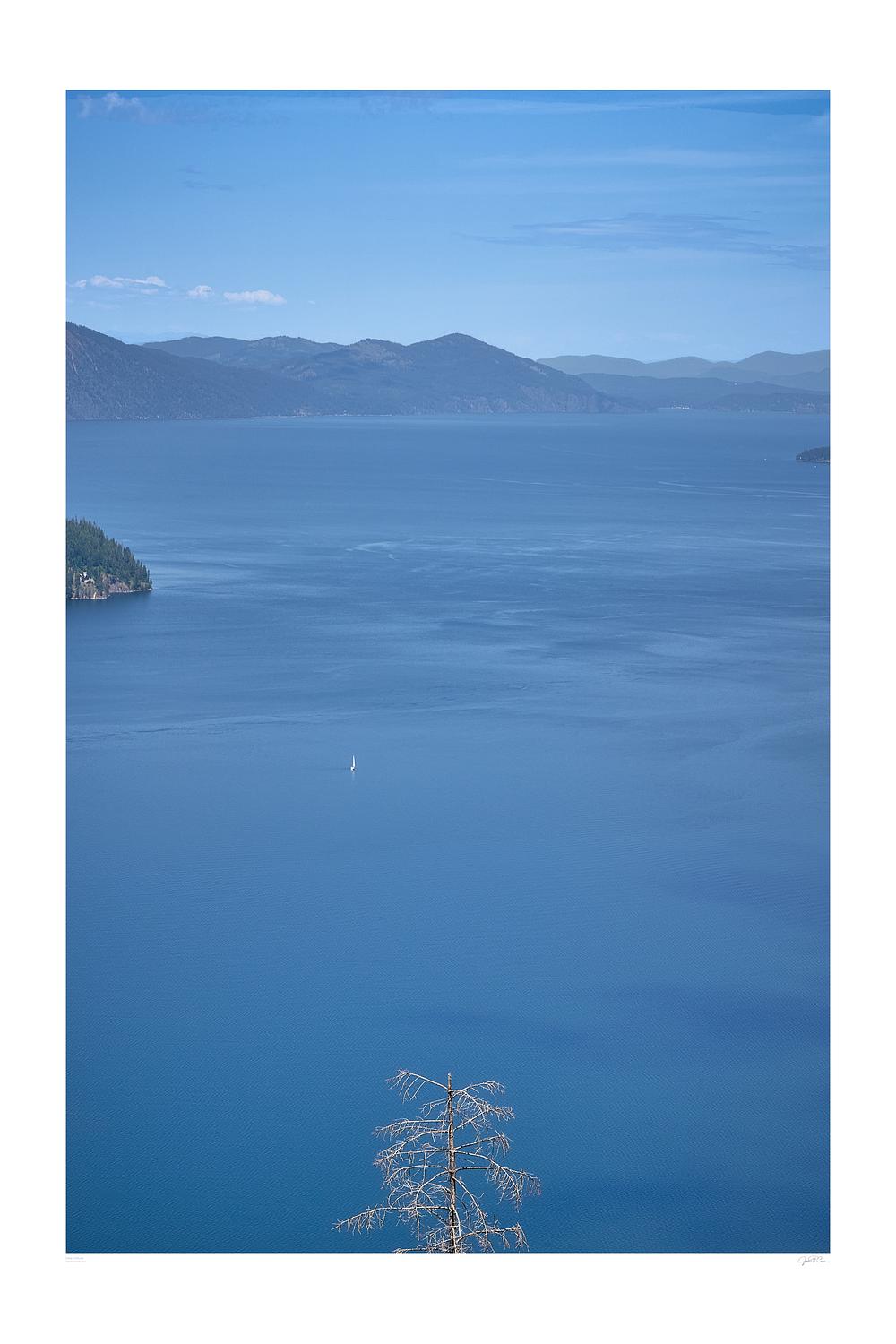 High above Lake Pend Orielle in the Idaho Panhandle, the remains of a fire-scorched tree cling to a steep hillside. Far below, a sailboat navigates the lake's deep waters between Bayview and Lakeview.