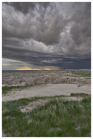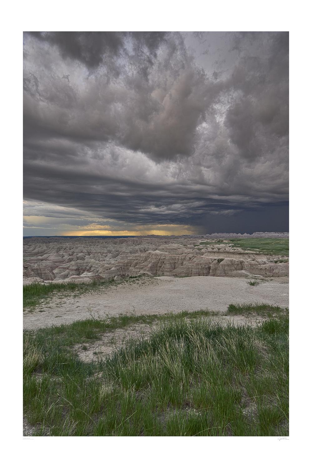 A miles-long line of storm clouds makes its way across the South Dakota landscape and Badlands National Park. In the distance, across the dramatic eroded topography of the Badlands, dark clouds and heavy rain block the light from the late-day sun.