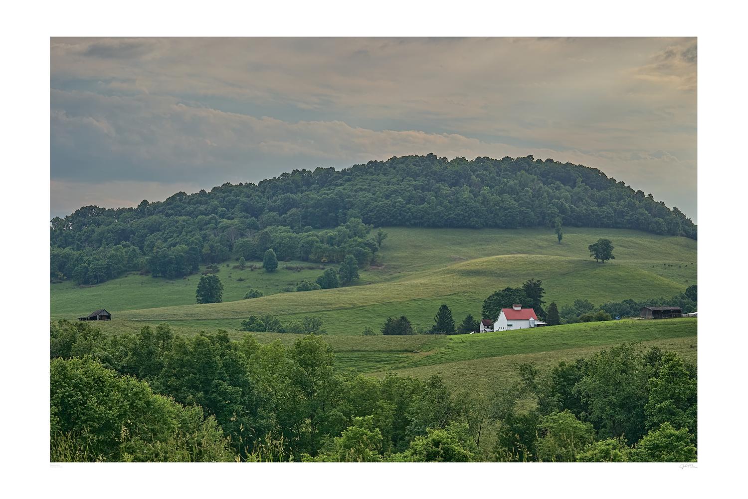 A white barn, nestled in the rolling green hills of northern West Virginia, catches the glow of the sinking sun.